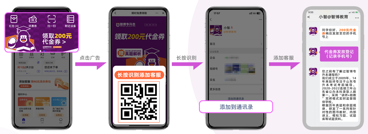 以与智博教育的合作为例,校广通对山东地区的14万+专科高校学生进行了精准定投,学生们洗衣时打开APP能看到“金榜题名”的开屏海报;付款成功时弹出“免费领取真题”“200元课程代金券”;Banner位、订单页、等待页多个触点联动,用户自然地跳转进小程序、进入直播、加到企业微信。
